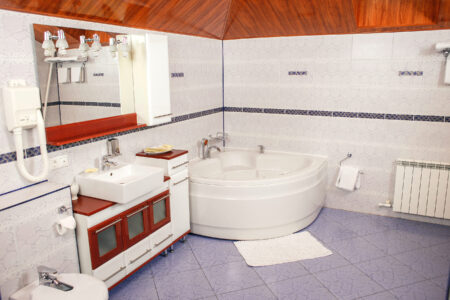 Просторный номер категории «Люкс» – оптимальный вариант для романтического вечера вдвоем или деловой поездки и комфортного отдыха. Номер состоит из большой гостиной комнаты, отдельной спальни и ванной комнаты, в которой вы найдете все для вашего удобства: фен, душевая кабина, джакузи, биде.